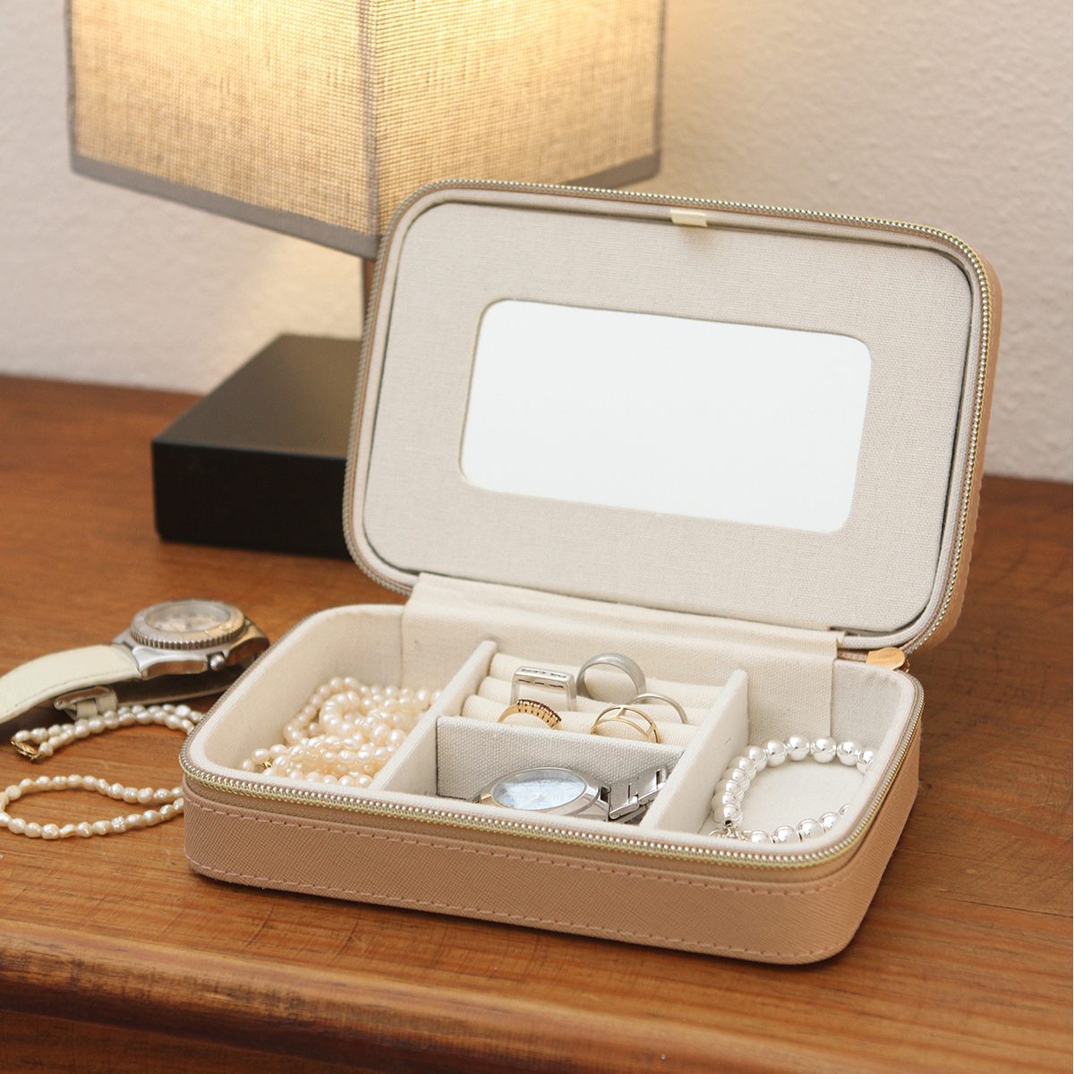 Quick ViewAlhajero con compartimento principal con cierre. Interior tipo terciopelo que protege la joyería de rayones y daños. Incluye 3 ganchos para collares, 6 ranuras para anillos, 1 bolsillo interior con elástico y 4 divisiones.