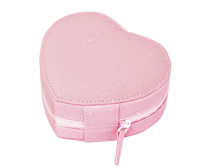 Quick ViewAlhajero portátil en forma de corazón con glitter y cierre. Suave interior tipo terciopelo para mayor protección, cuenta con 3 ganchos para colgar collares o pulseras, bolsa interna con elástico, panel central abatible para 6 juegos de aretes, 5 ranuras para anillos y 2 divisiones para diferentes accesorios.
