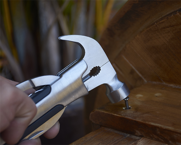 Quick ViewCompleta herramienta plegable tipo martillo con 11 funciones. Incluye: martillo, pinzas, cortador de alambre, sacaclavos, 2 desarmadores planos, desarmador de cruz, destapador, lima, cuchillo y sierra. Cuenta con seguro de bloqueo para fijar las herramientas. Incluye estuche de tela en color negro. Presentación: caja en color blanco.