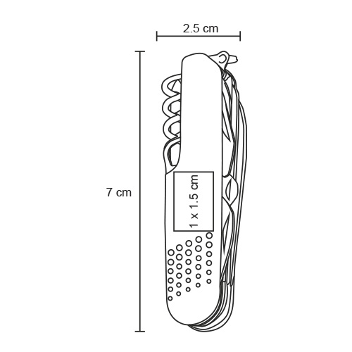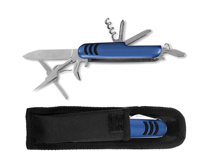 Quick ViewNavaja metálica multiusos con 11 funciones que contiene: navaja, sacacorchos, 2 destapadores, 1 con punta plana, escariador, tijeras, sierra, descamador con quita anzuelos, desarmador de cruz, lima con limpia uñas, enhebrador de agujas y arillo para usar como llavero.