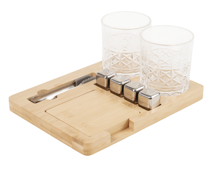 Quick ViewSet para whisky que incluye: 2 vasos de cristal, pinzas de acero inoxidable con puntas de silicón, 4 hielos de acero inoxidable y 2 portavasos y base de bambú para colocar los accesorios. Presentación: Caja en color negro.