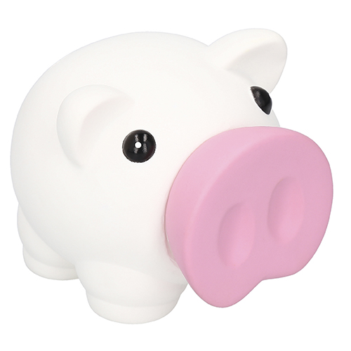 Alcancía de plástico en colores translúcidos en forma de cerdito con tapón tipo rosca en la parte inferior.