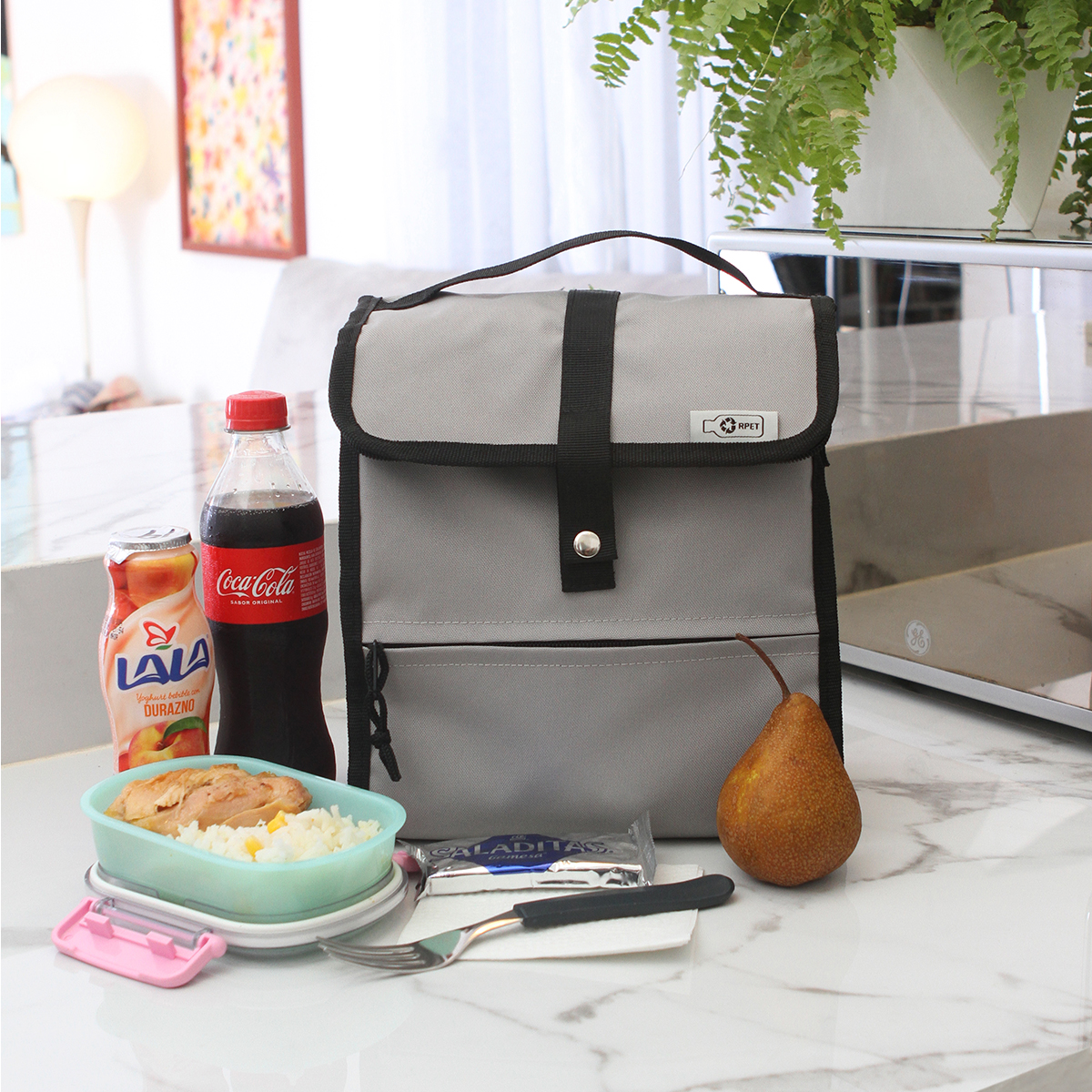 Quick ViewLonchera térmica fabricada en poliéster reciclado (RPET) , con 2 formas de cerrar, bolsillo frontal con cierre y asa superior. Esta bolsa es ideal para mantener tus alimentos frescos y en buen estado. El RPET es un material resistente y duradero que puede soportar el uso diario y el desgaste, lo que lo hace ideal para productos textiles. Además es sostenible porque utilizan materiales reciclados en su fabricación, lo que reduce la cantidad de residuos y disminuye el impacto ambiental.