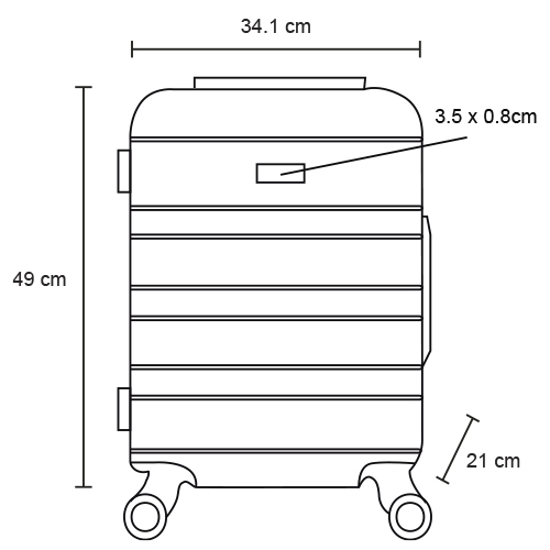 Quick View56 x 35,5 x 20,5 cm. Capacidad 38 litros. Peso aproximado 2,7 kg. 100% ABS. Interior 210D. Valija / Maleta pequeña. 8 ruedas con giro 360°. Manija de transporte reforzada y engomada. Mango extensible hasta 48 cm. 2 posiciones. Interior: 2 compartimentos principales con cierre y elásticos ajustables. Placa metálica desmontable para grabado (medida: 5,3 x 3 cm.) Candado incluido con combinación donde se enganchan los cierres.