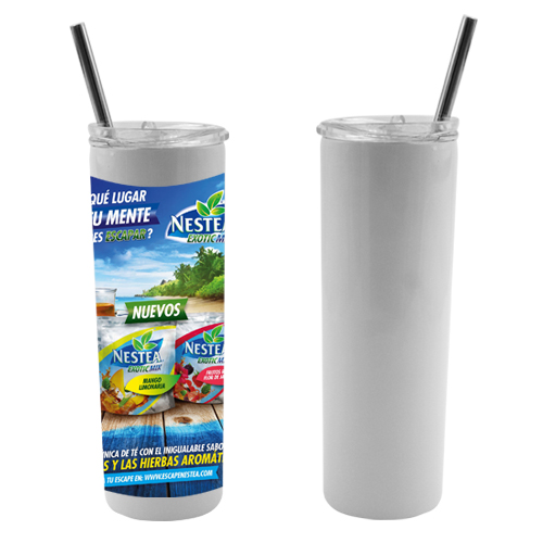 Termo sublimable con doble pared de acero inoxidable, acabado glitter, tapa de plástico a presión con boquilla deslizable y popote metálico.