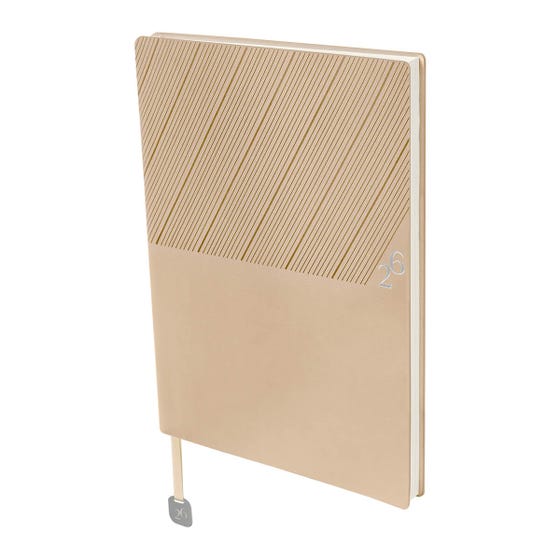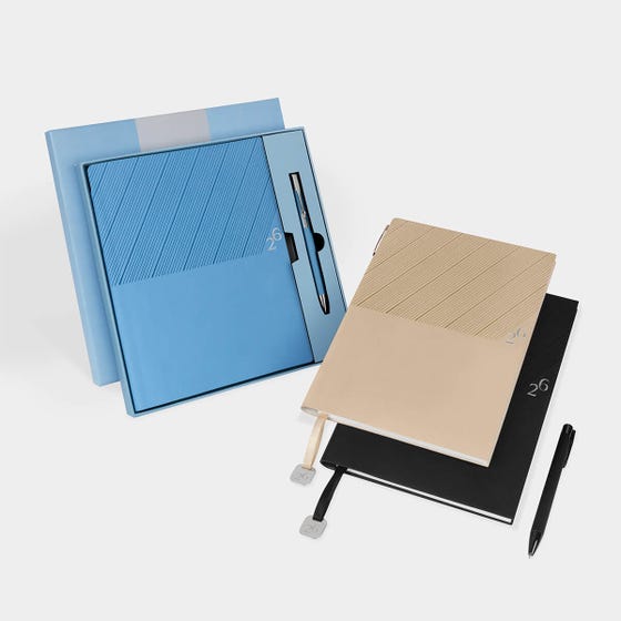 Agenda semanal con 100 hojas. Contiene datos personales, calendarios 2025-2026-2027, planeador 2026, presupuesto de gastos, seguimiento de nuevos hábitos, organizador de tareas, planeador de proyectos y días festivos. Incluye caja individual del mismo color a la agenda, separador con placa metálica y bolígrafo.