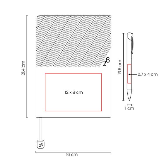 | Medida | 16 x 21.4 cm Agenda / 1 x 13.5 cm Bolígrafo |