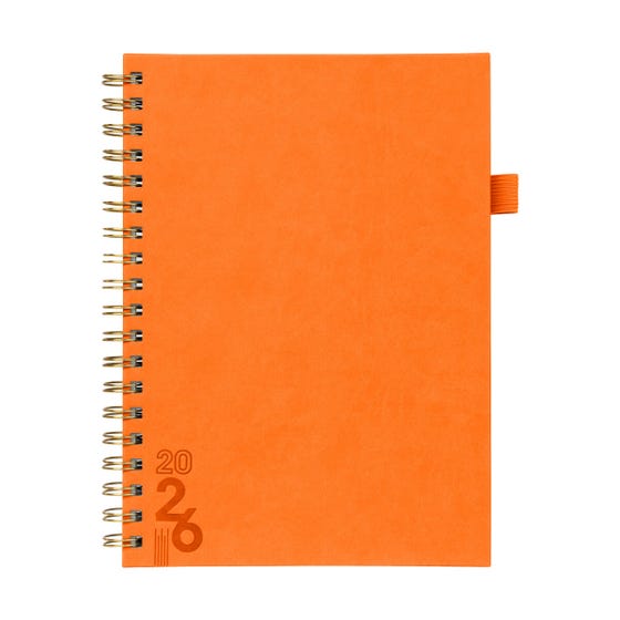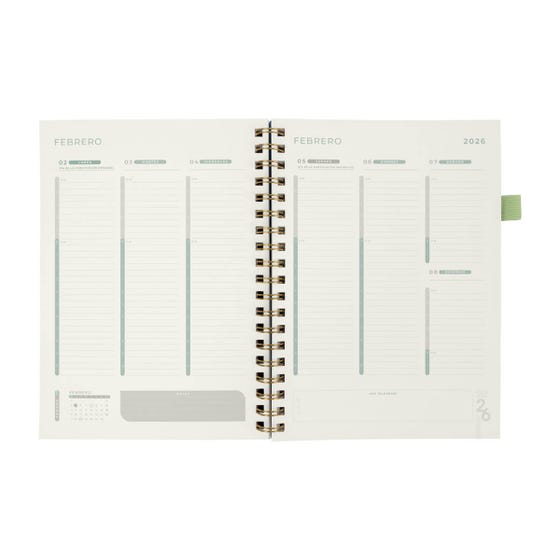 Agenda semanal con 80 hojas. Contiene datos personales, calendarios 2025-2026-2027, planeador 2026, seguimiento de nuevos hábitos, organizador de tareas, planeador de proyectos y días festivos. Incluye caja individual del mismo color a la agenda y bolígrafo.