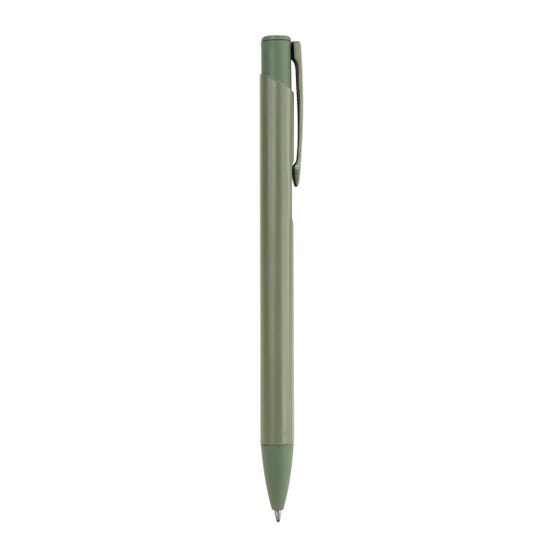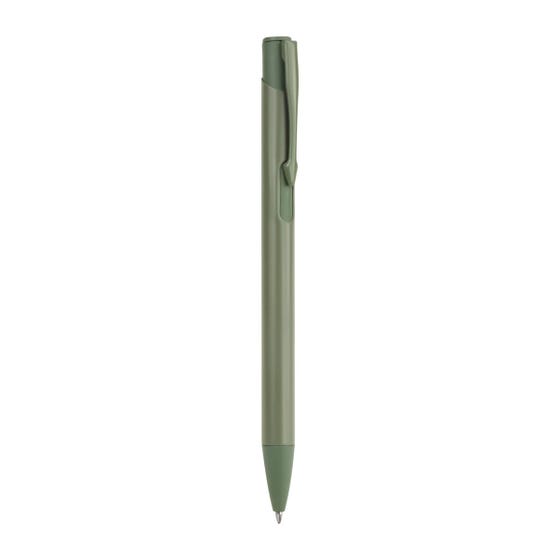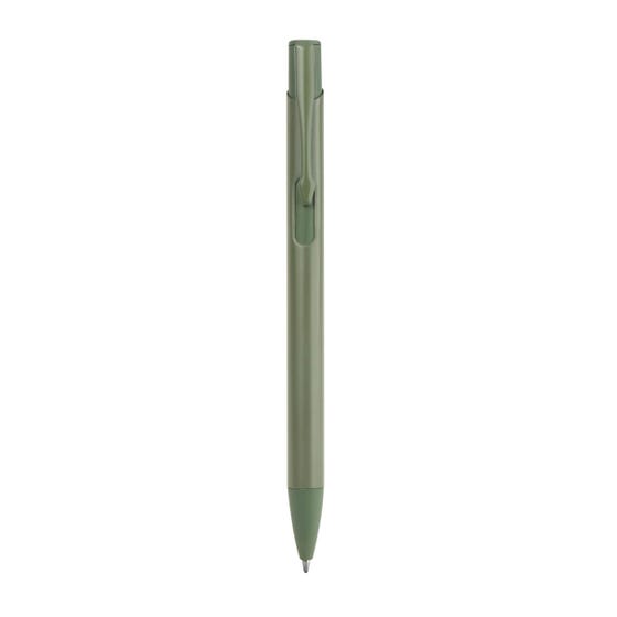Bolígrafo metálico con acabado mate y clip a color. Mecanismo pulsador.