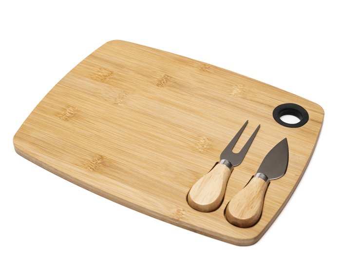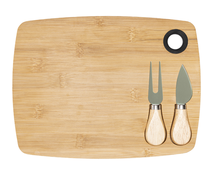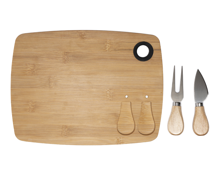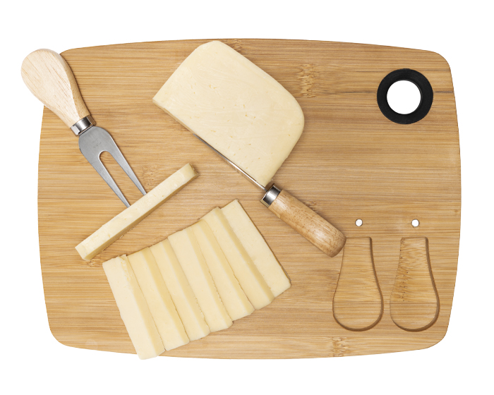 Tabla para quesos y carnes frías de bambú que incluye: 1 cuchillo y 1 tenedor de acero inoxidable con mango de madera. La tabla cuenta con 2 imánes y 2 compartimentos para colocar los utensilios y un arillo de silicón para sostener la tabla o colgar. Presentación: caja en color blanco.