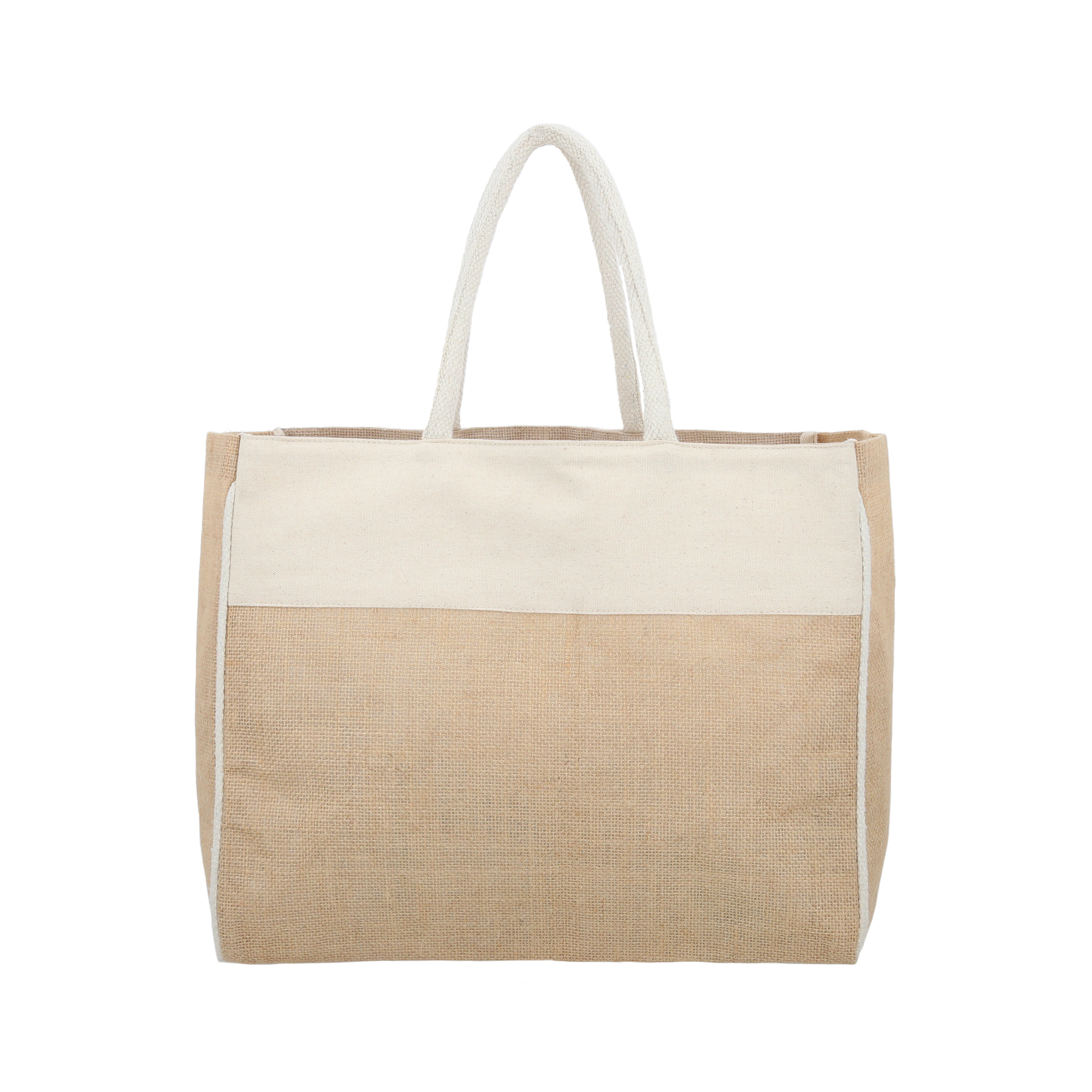 Bolsa de yute laminada con algodón, fuelle y asas.