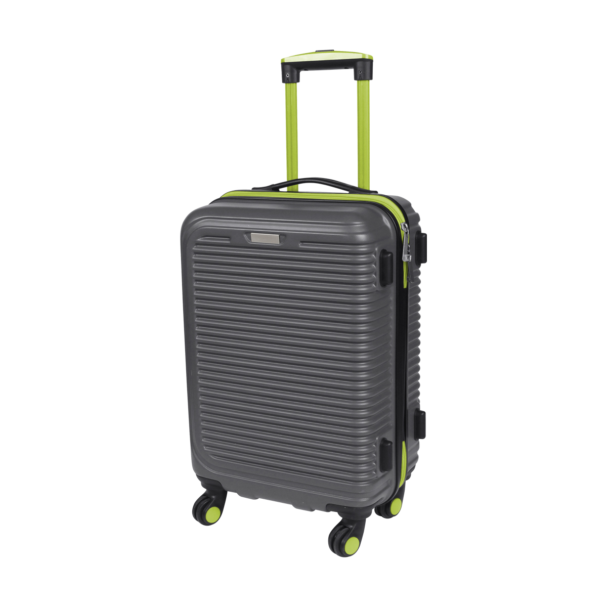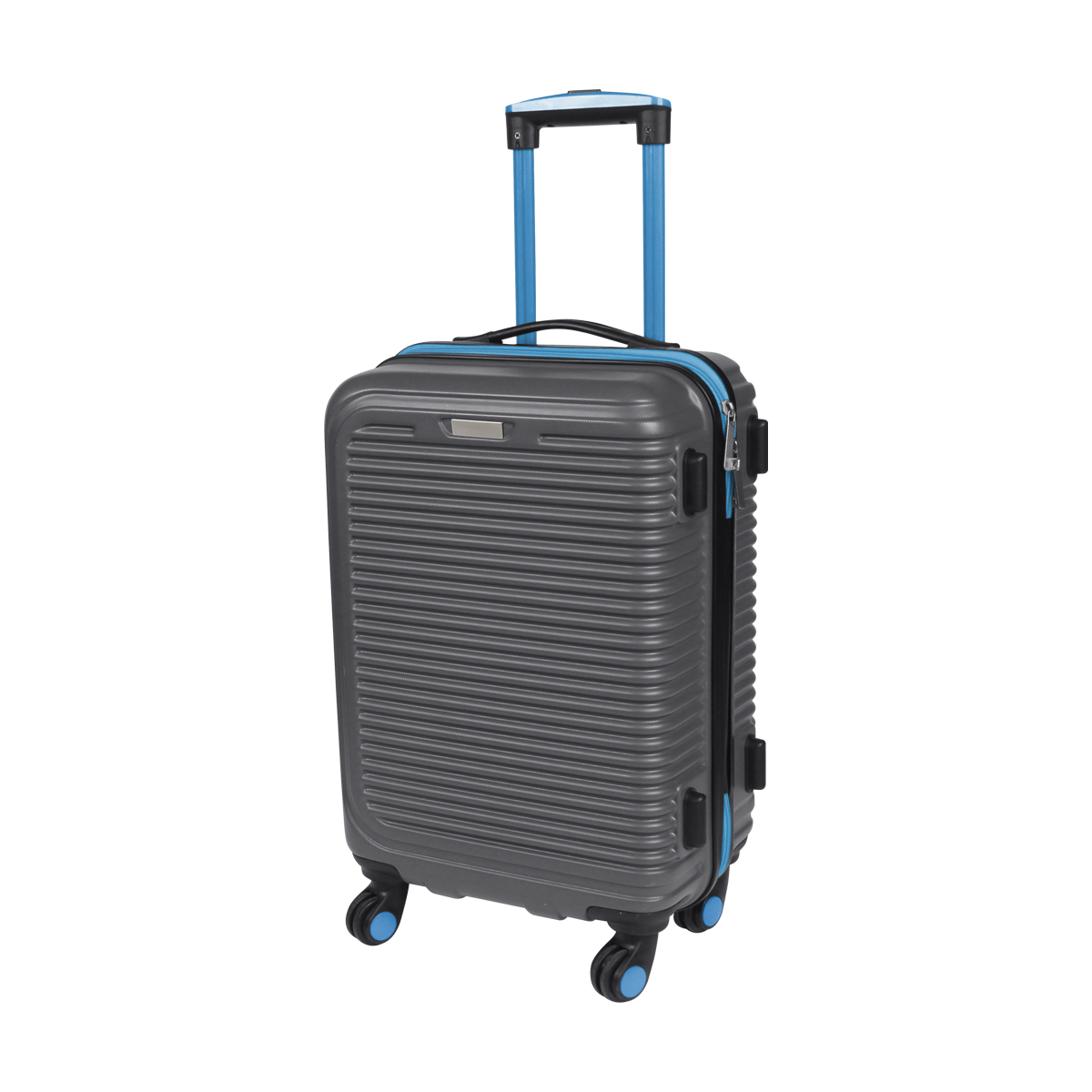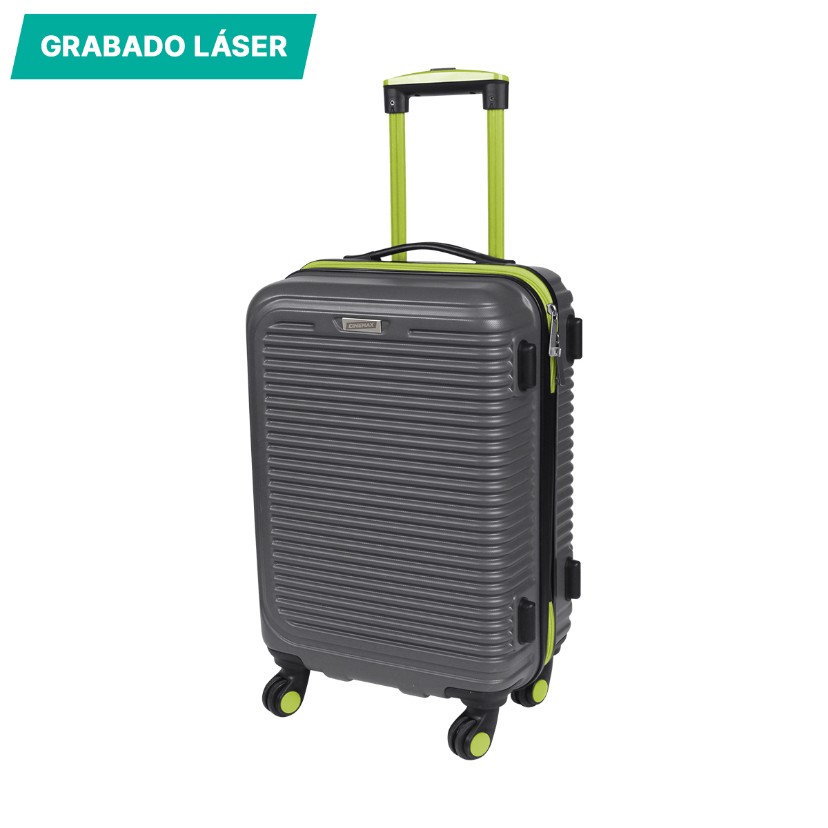 Maleta rígida de viaje tipo carry on color gris, con ruedas y cierre en diferentes colores fabricada en ABS con interiores en poliéster, con mango retráctil, chapa de seguridad, placa metálica, doble compartimento interior con cierre y tensor para ropa.