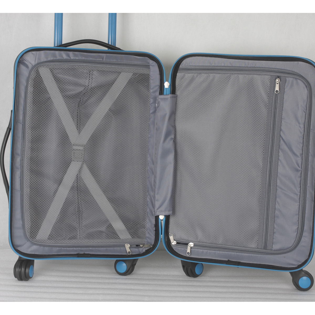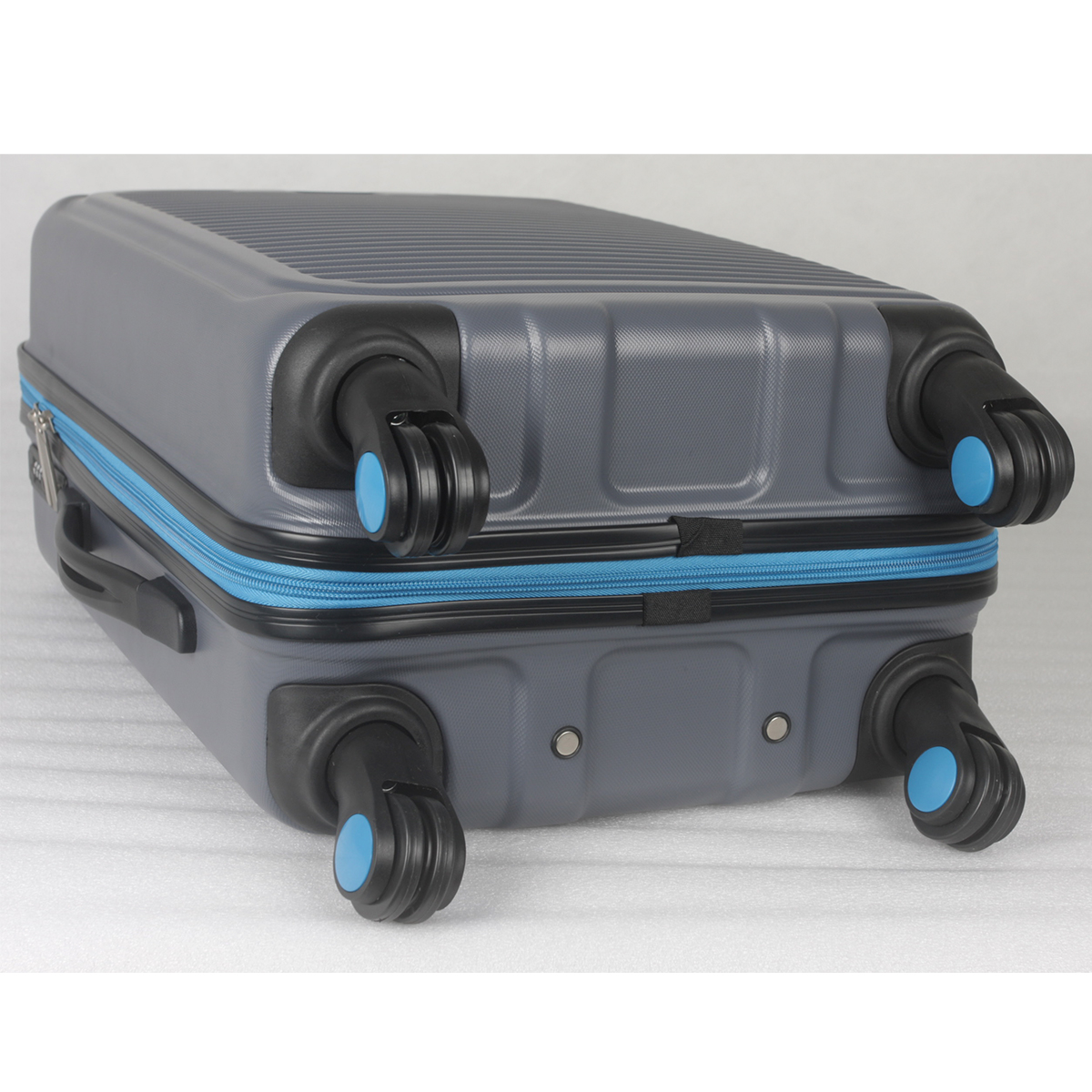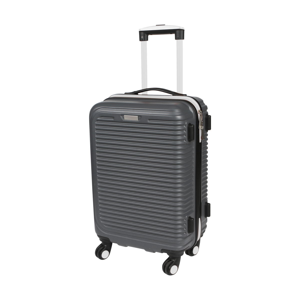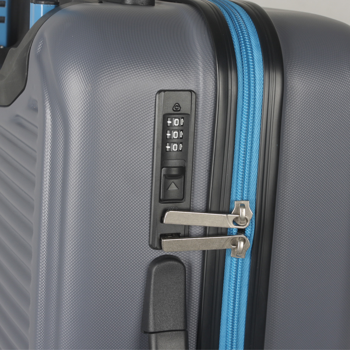 Maleta rígida de viaje tipo carry on color gris, con ruedas y cierre en diferentes colores fabricada en ABS con interiores en poliéster, con mango retráctil, chapa de seguridad, placa metálica, doble compartimento interior con cierre y tensor para ropa.