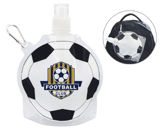 Bolsa para bebidas con diseño de balón de fútbol, con tapa de rosca y válvula con tapón, incluye arnés metálico para colgar. CAP. 800 ml.