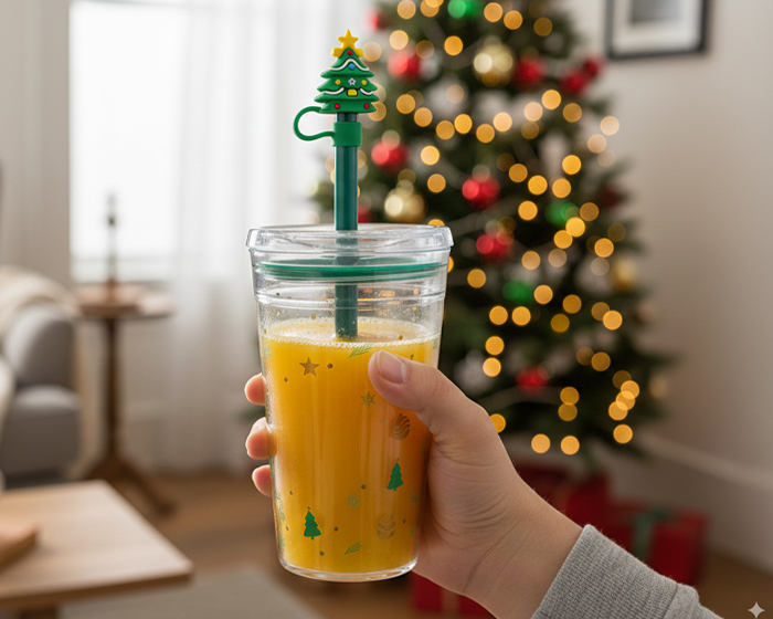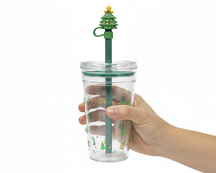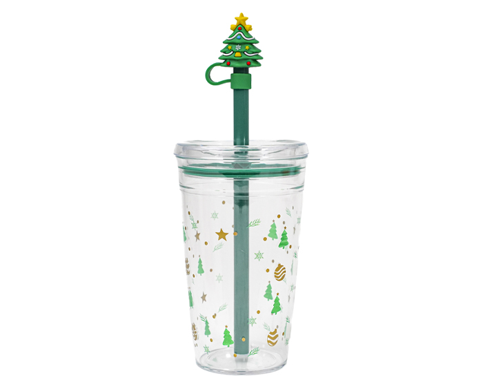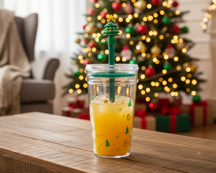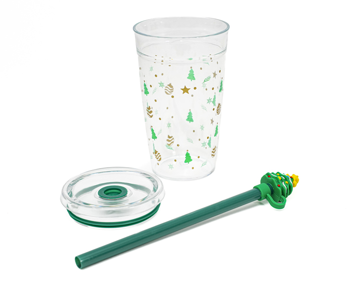 Vaso coleccionable de plástico transparente con motivos de Navidad, cuenta con tapa a presión anti derrames, sellos de silicón y popote verde con protector de popote en forma de Árbol Navideño. Es ideal para bebidas frías. CAP. 450ml. Presentación: Caja kraft.