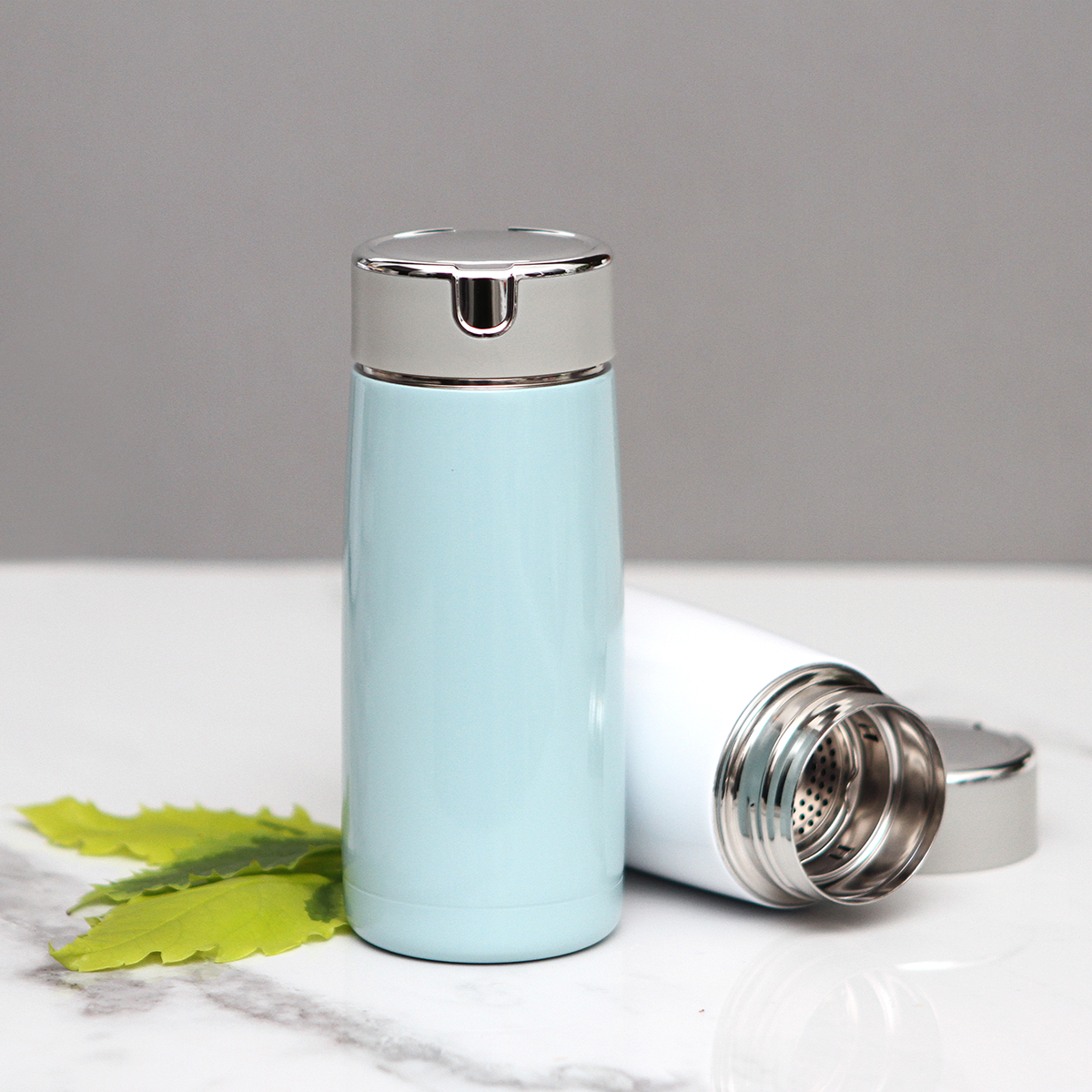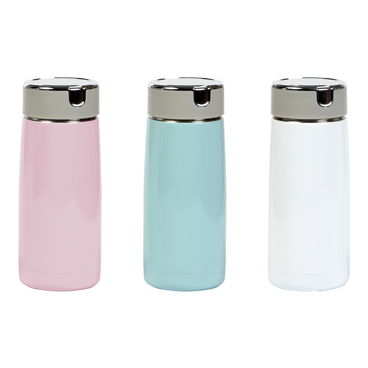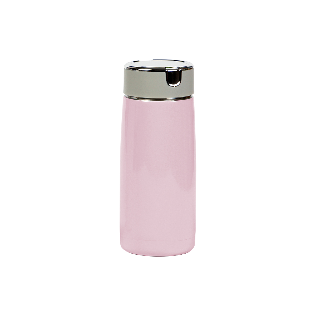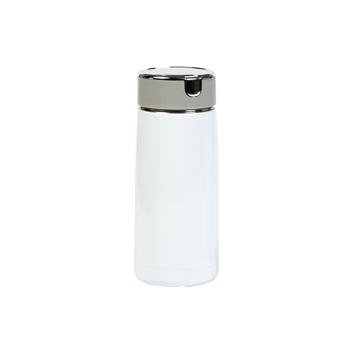 Termo de acero inoxidable con acabado brillante, doble pared con tapa de plástico de rosca, fabricado en materiales de grado alimenticio, mantiene bebidas frías o calientes por un largo tiempo. No usar en microondas. Capacidad de 310 ml. Incluye caja de cartón individual.