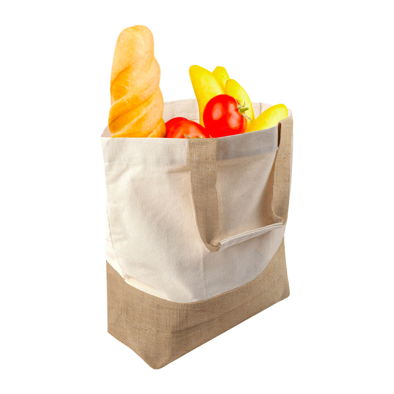 Bolsa de algodón cosida con yute en la parte inferior y asas.