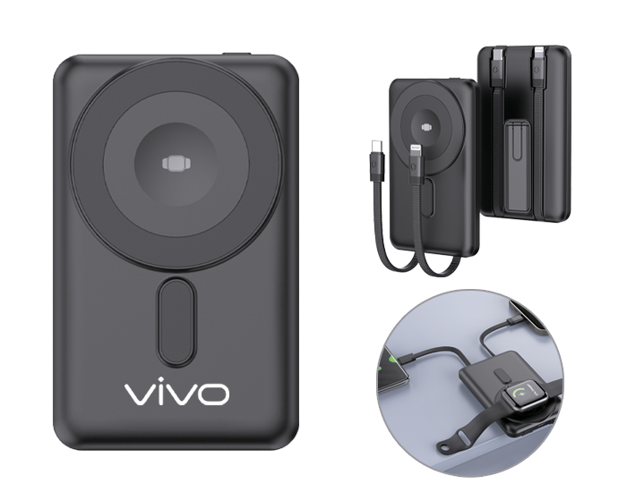 Batería inalámbrica portátil wireless de carga rápida, con función de carga magnética para dispositivos móviles (15W) y relojes inteligentes(2.5W). Capacidad de 5,000 mAh, 5 indicadores de luz de carga de la batería, entrada de carga tipo C (Incluye cable de carga), botón de encendido/apagado y 2 cables de salida para carga de dispositivos móviles: 1 entrada tipo C y uno… Ver más