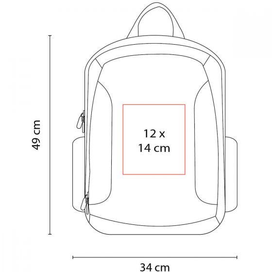 Bolsa principal con espacio para laptop. Bolsa central para tablet. Bolsa frontal con compartimentos para celular, bolígrafos y documentos. Bolsas laterales con cierre. Respaldo con cierre y porta celular interno. Respaldo y tirantes acojinados. Compartimento inferior con funda impermeable para la mochila. Incluye porta llaves.