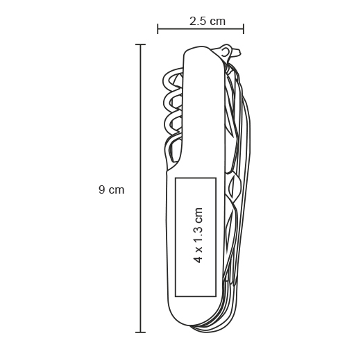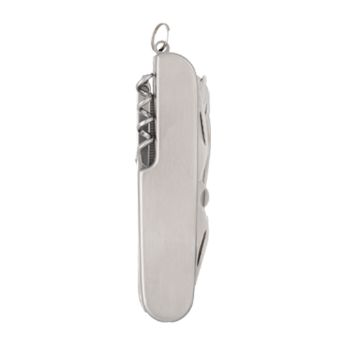 Navaja metálica multiusos con 11 funciones que contiene: navaja, sacacorchos, 2 destapadores, 1 con punta plana, escariador, tijeras, sierra, descamador con quita anzuelos, desarmador de cruz, lima con limpia uñas, enhebrador de agujas y arillo para usar como llavero.