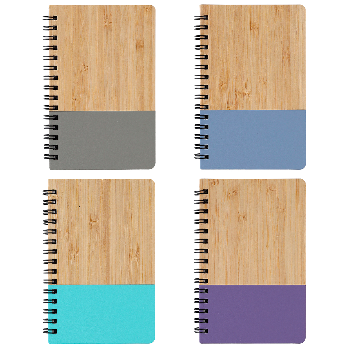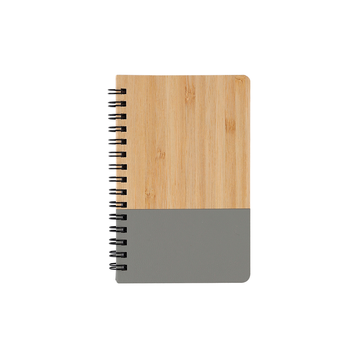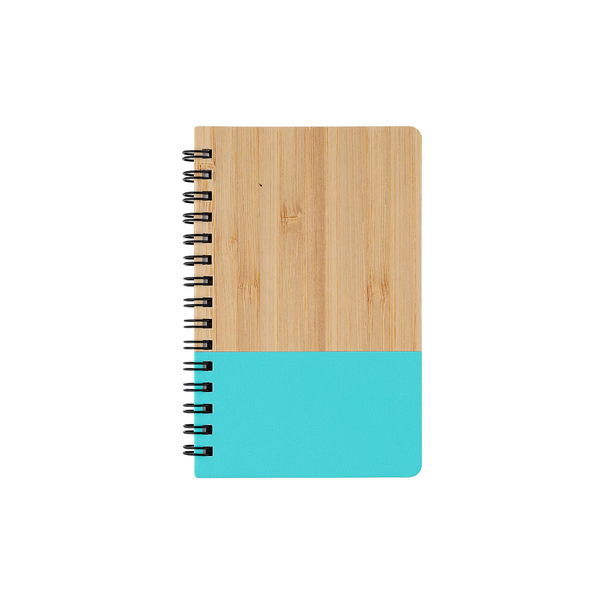 Libreta con pasta de bambú y detalle de color en plástico PU, espiral metálica y 60 hojas rayadas de 70 g. Tamaño A6.