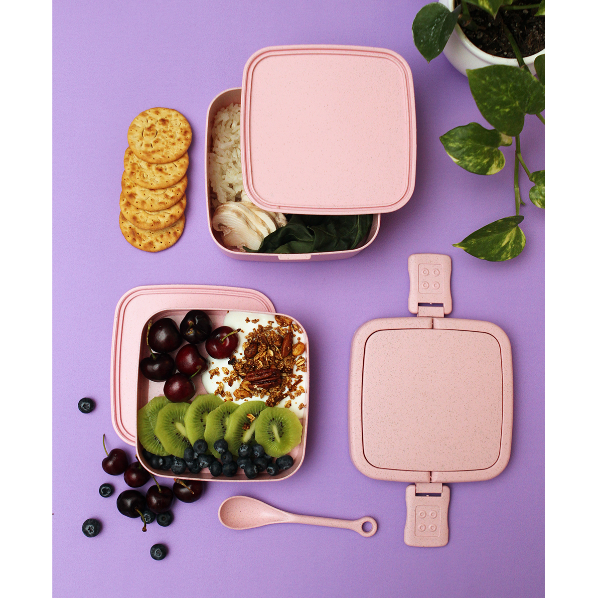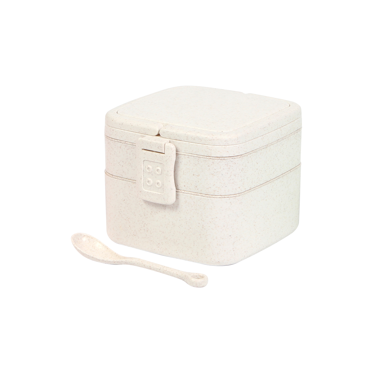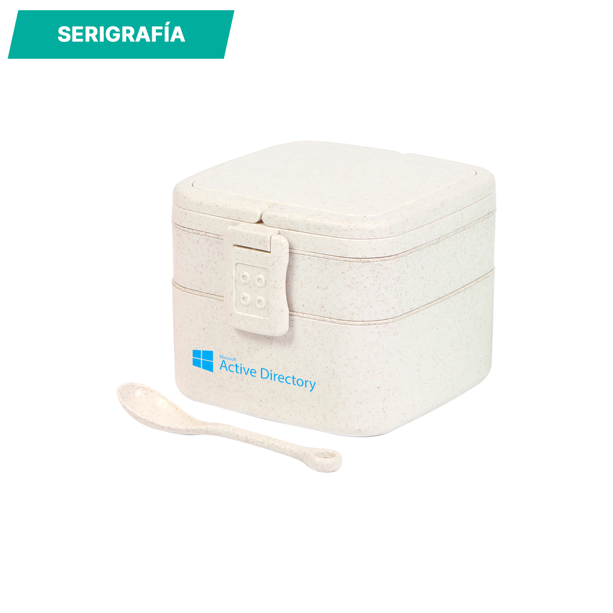 Contenedor de alimentos fabricado en fibra de trigo, con tres compartimentos y broches laterales de seguridad. Incluye cuchara del mismo material, capacidad de 1,000 ml. La mejor opción para llevar tus alimentos.