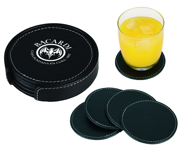 Juego de 4 portavasos redondos de curpiel con detalle de costura en hilo blanco. Incluye base del mismo material. Presentación: caja en color blanco.