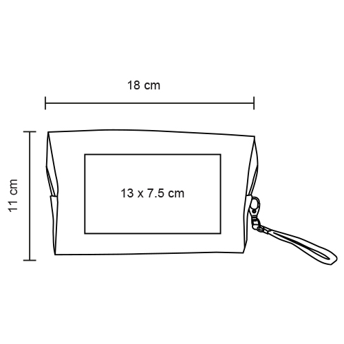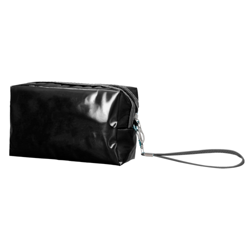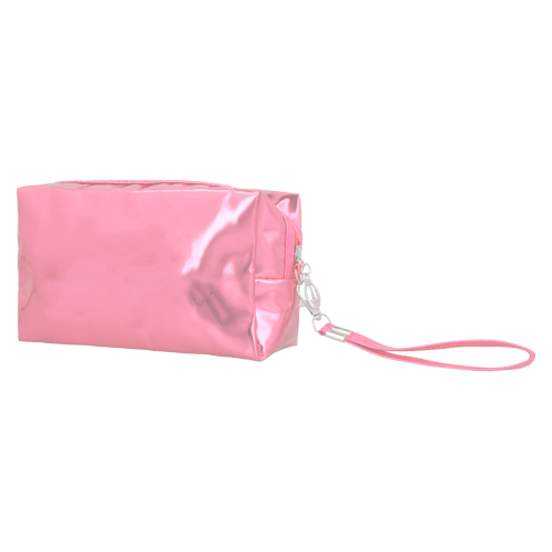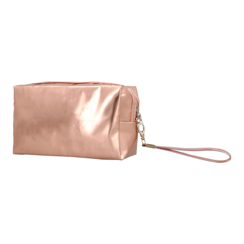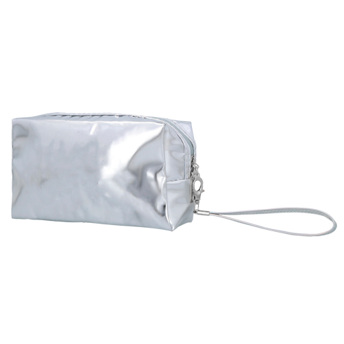 Cosmetiquera de PVC con acabado metálico, cierre, correa intercambiable y fuelle.