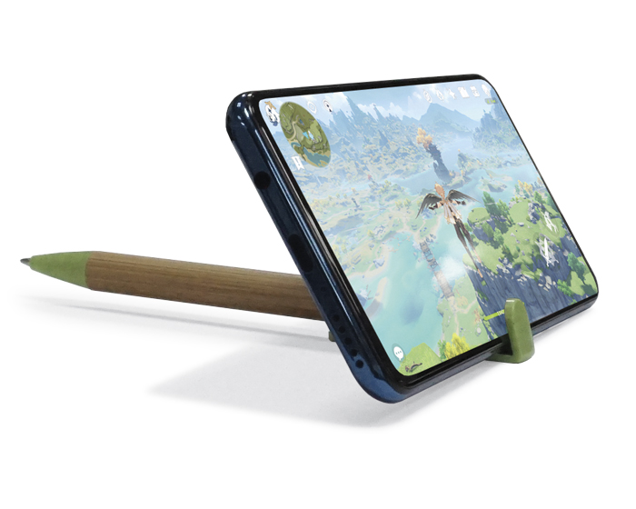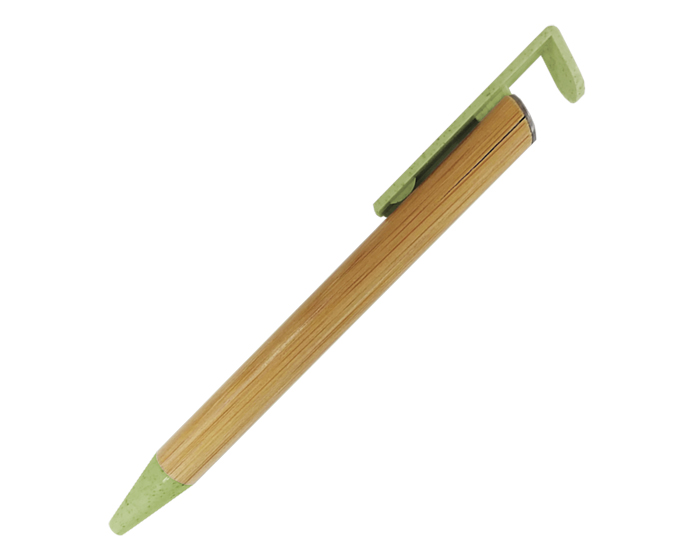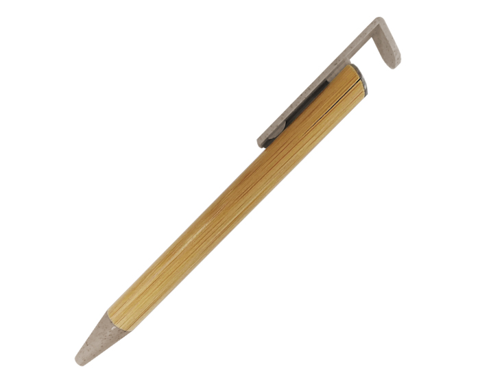 Bolígrafo ecológico con cuerpo de bambú, punta y parte superior de fibra de trigo, misma que sirve como soporte para celular. Mecanismo de click.